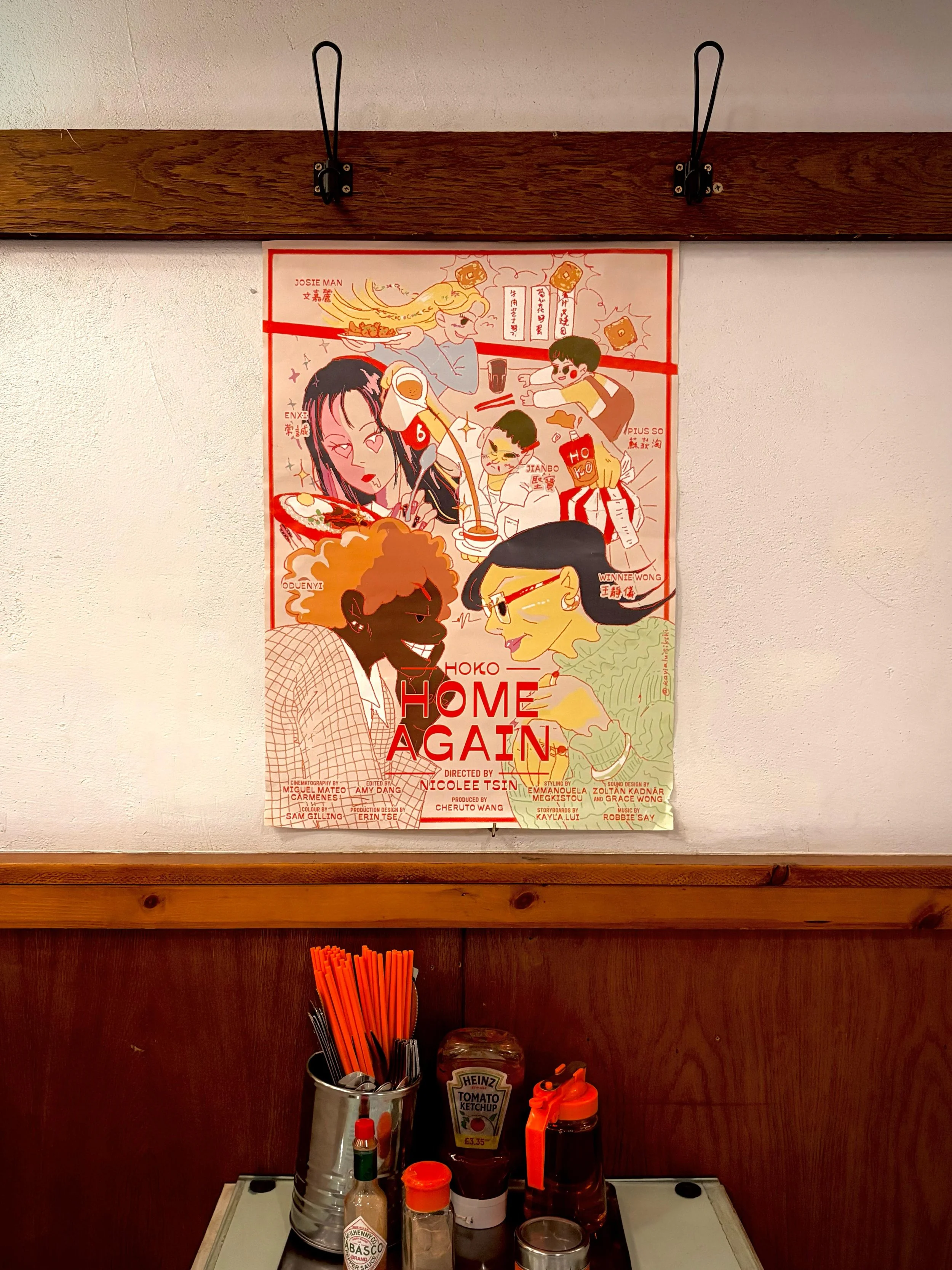 This is an illustrated poster about the feeling of being home again a busy cha chaan teng. The poster was originally made for the eponymous film for HOKO, directed by Nicolee Tsin.